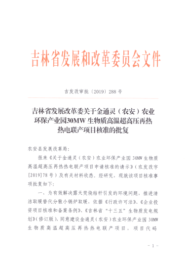 2019年11月11日,吉林省发改委发布了《关于金通灵(农安)农业环保产业园30MW生物质高温超高压再热热电联产项目申请核...